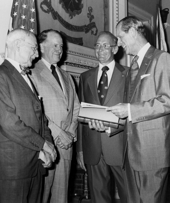 Charles E. Peterson (second from left) greets Prince Philip (right), at Carpenters Hall, July 1976. Charles E. Peterson Collection, Special Collections of the University of Maryland Libraries
